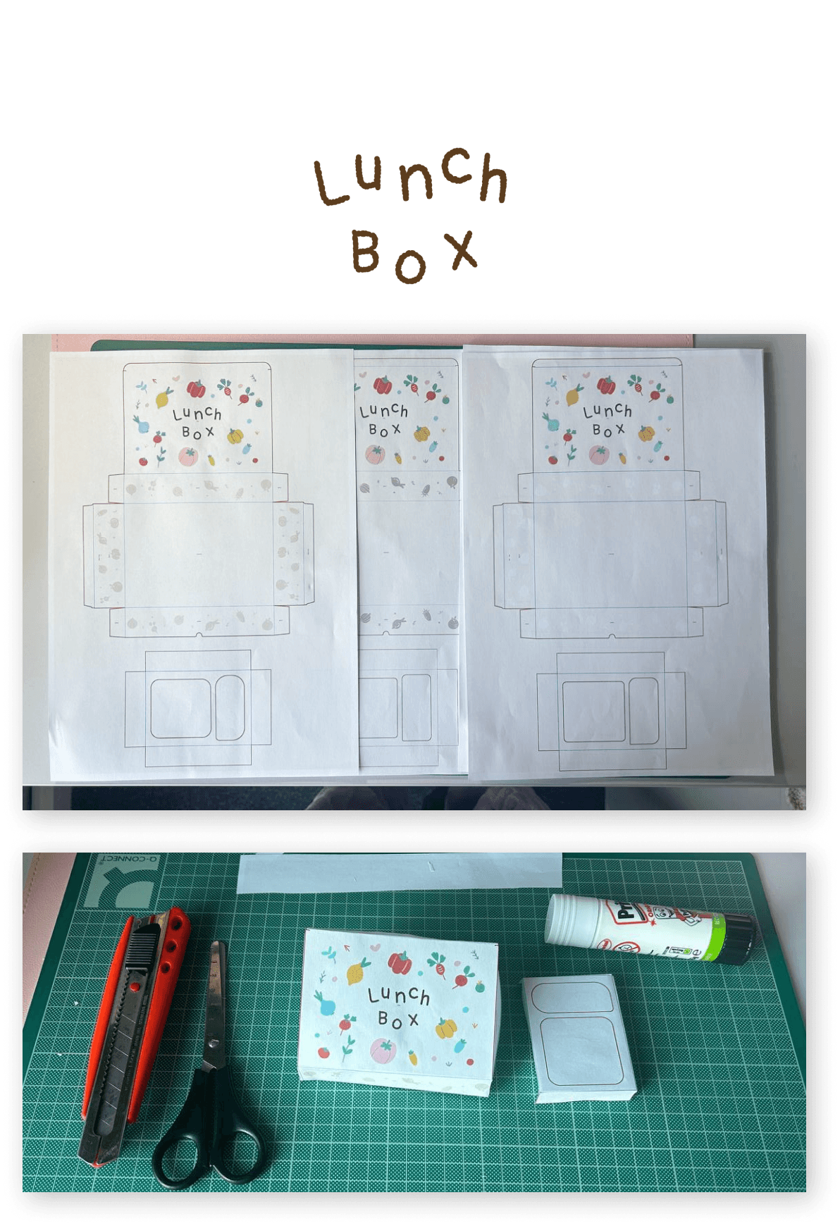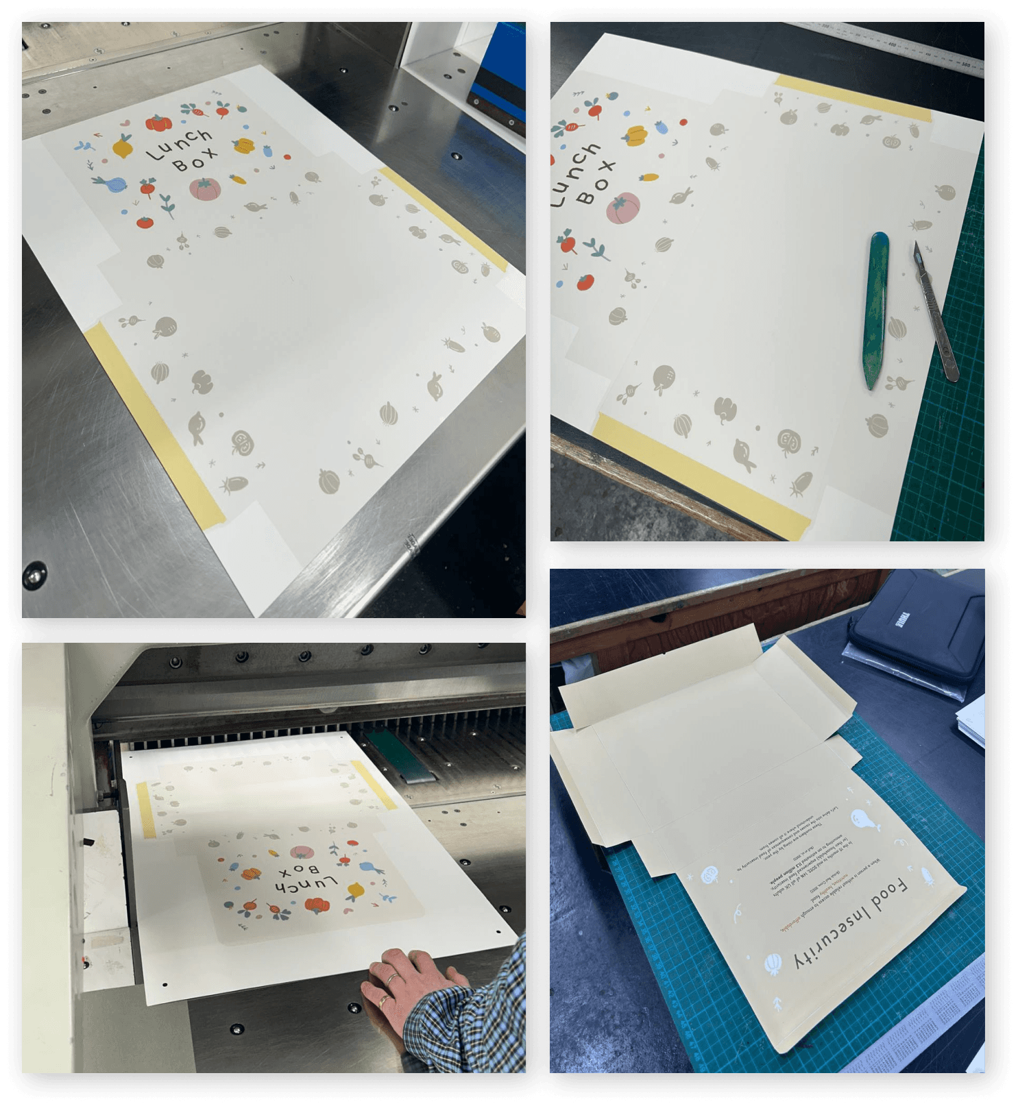 After creating Photoshop mockups and testing color variations with mini A4 printouts, I printed the dieline on the workshop's wide printer. With help from technicians, I made the necessary cuts and folds, before bringing it home to manually glue the sides and fold it up.
