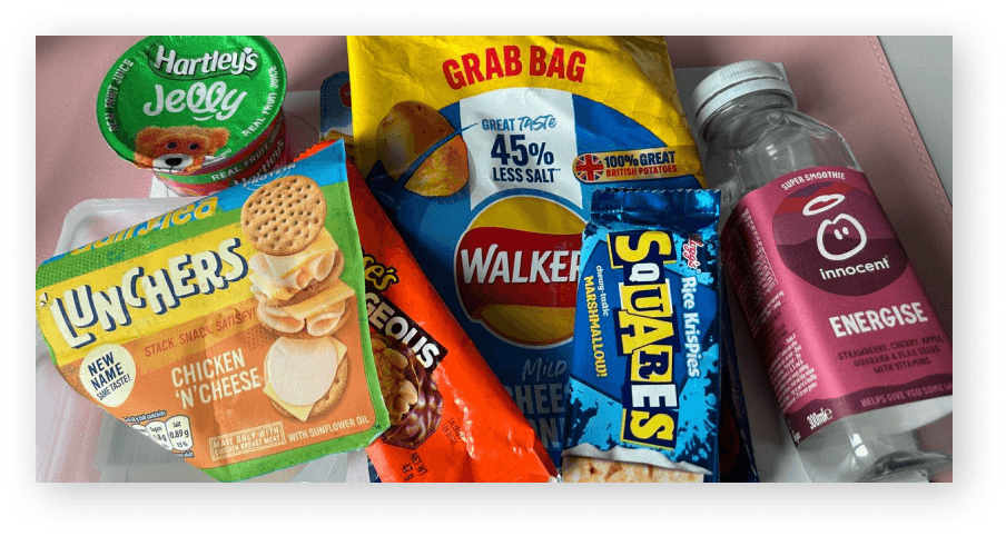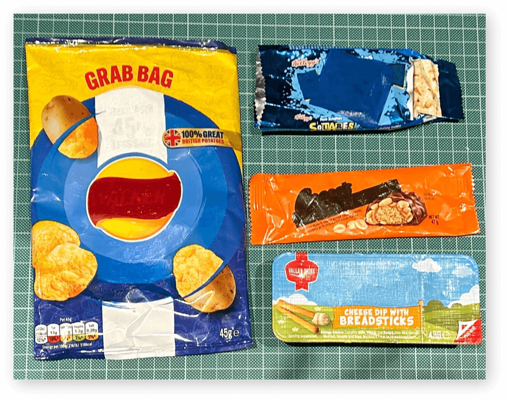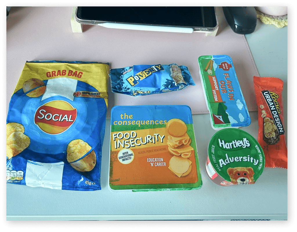 To realistically represent the contents of a lunchbox from a food-insecure household, I needed to identify common, less-nutritious school lunch items. This involved researching online blogs and Reddit forums. The props were then prepared by emptying, washing, and obscuring the packaging.
