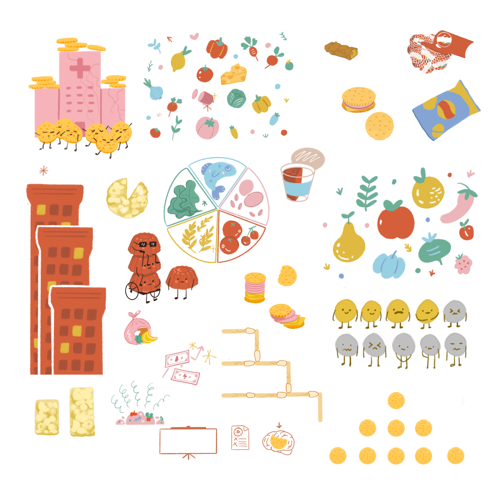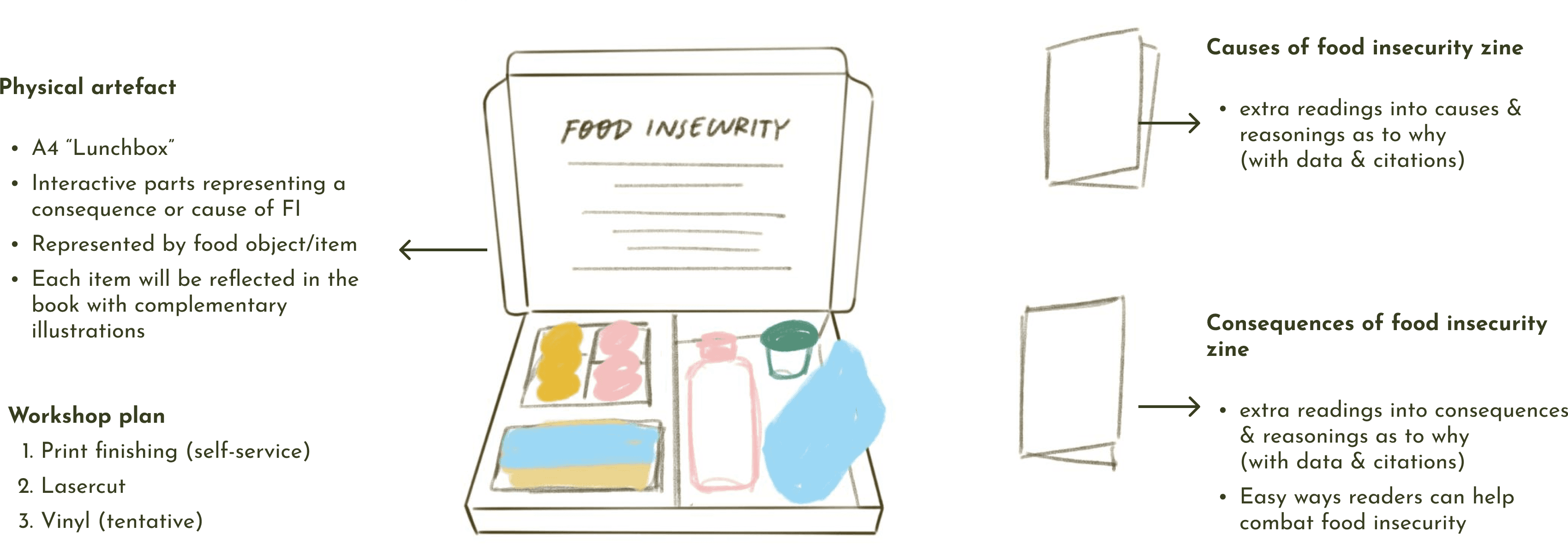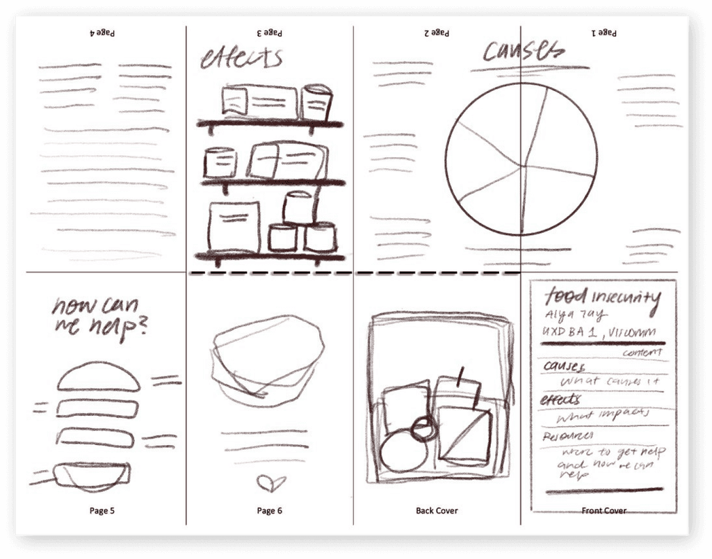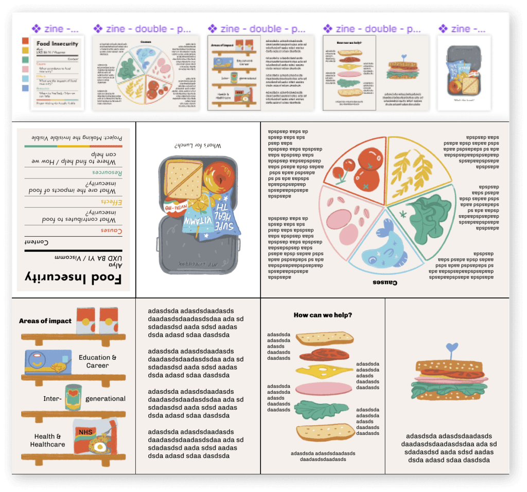My zine design process began with Procreate, where I used a template to create the layout. The initial concept encompassed the causes, consequences, and ways to address food insecurity. I further developed this idea with a low-fidelity version in Figma.
