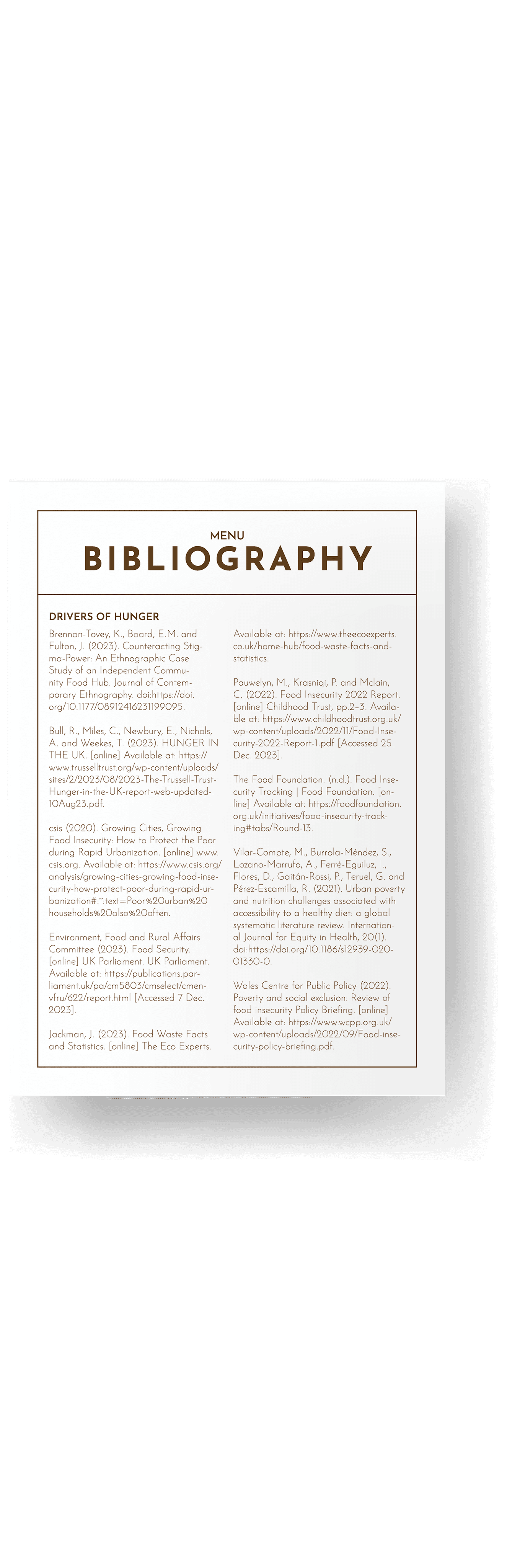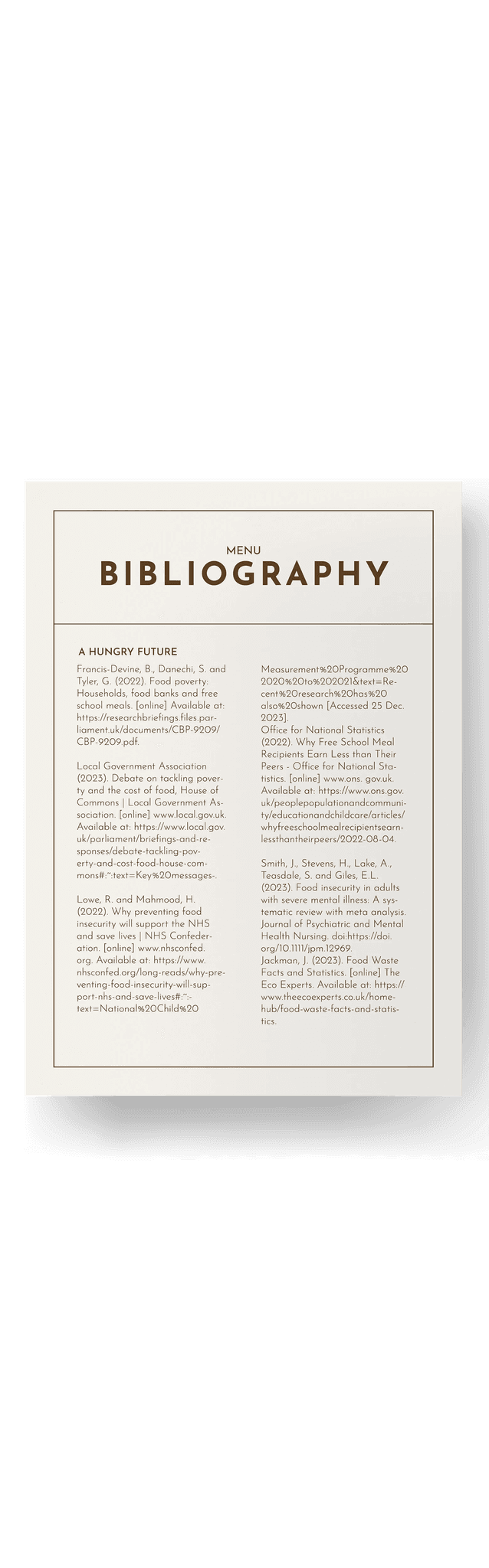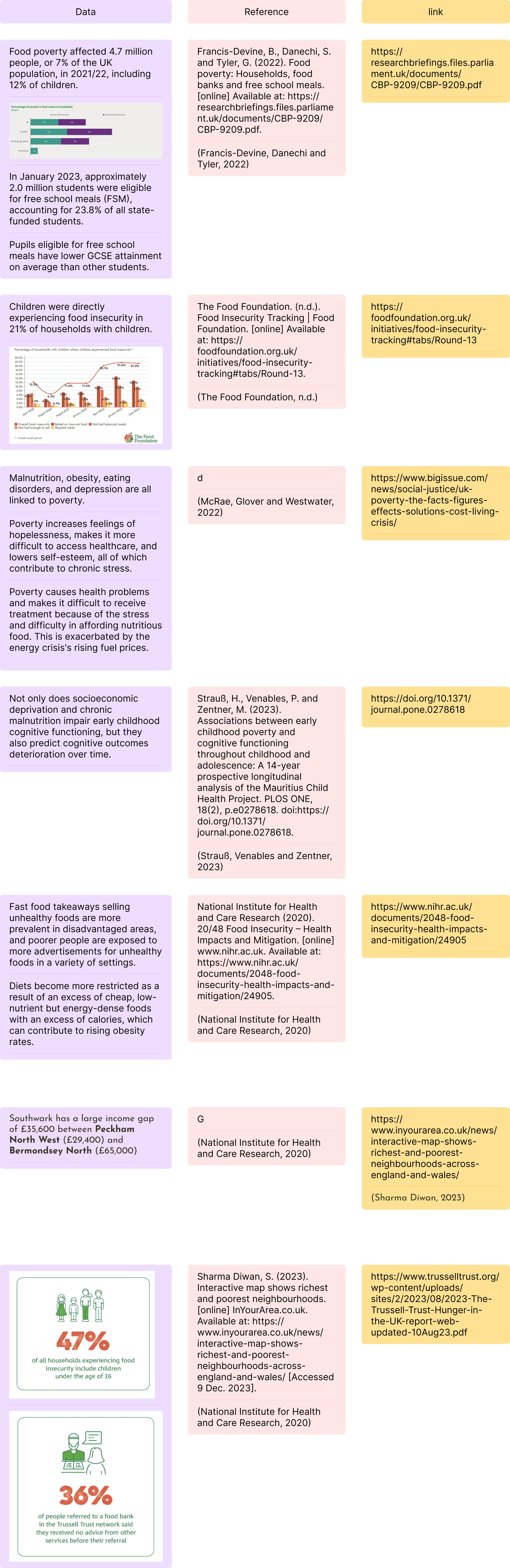 I researched the UK's food poverty landscape through a variety of sources (Articles, journals and research papers), and explored topics such as the causes and consequences of food insecurity, the role of urban design, food banks, obesity, food inflation and more.